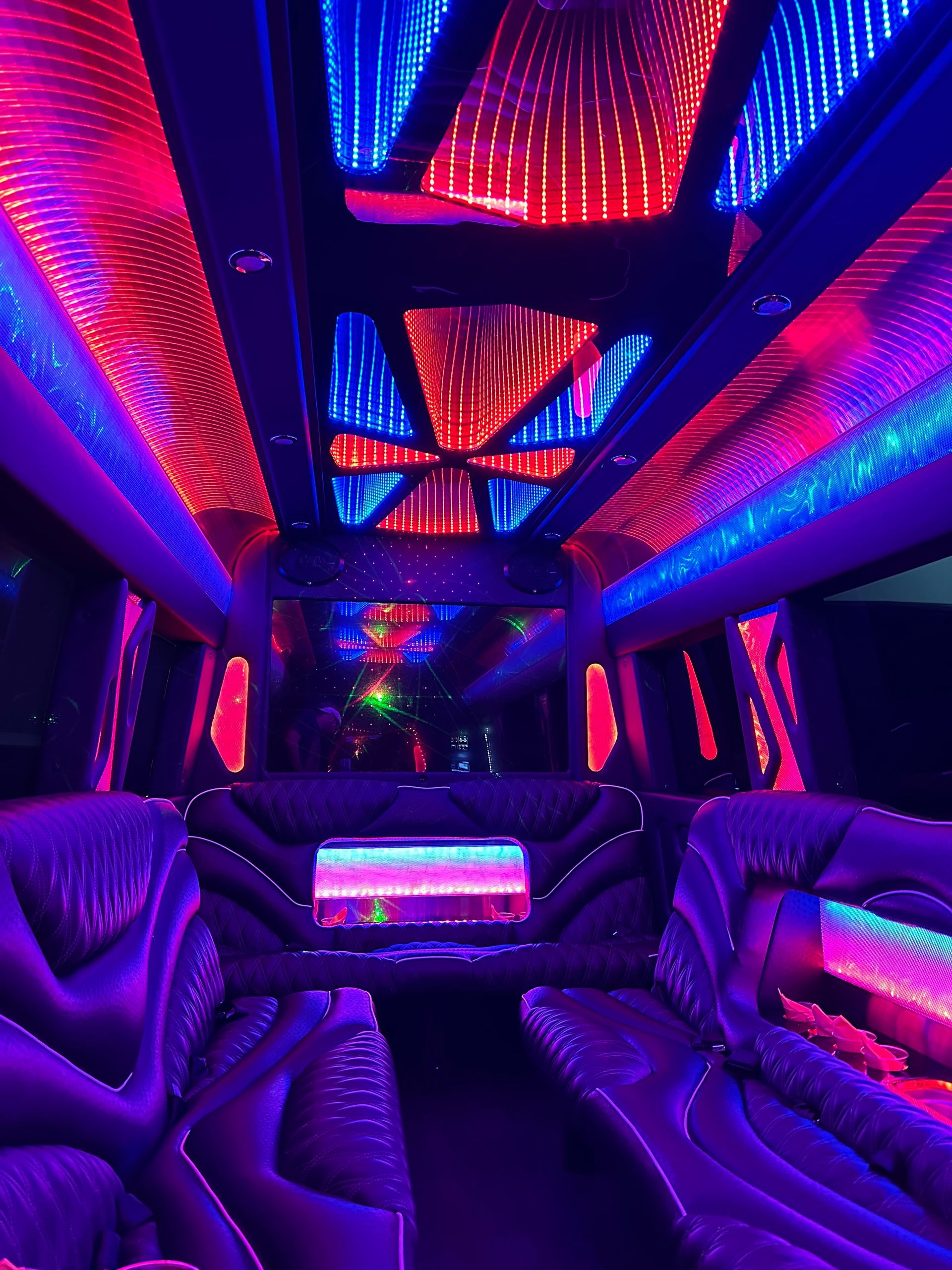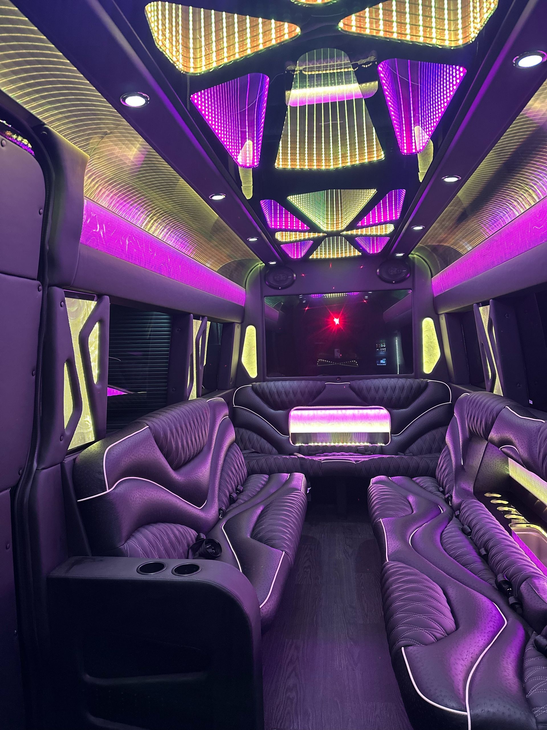 With a seating capacity of up to 14-15 passengers, the Sprinter Limo is designed for group travel without compromising comfort. The one 55″ LCD screen, Bluetooth connections, and powerful 2000-watt audio system ensure top-tier entertainment for every passenger. From corporate meetings on the go to fun-filled nights out, the Sprinter Limo creates an unforgettable atmosphere with Infiniti and strobe lighting.